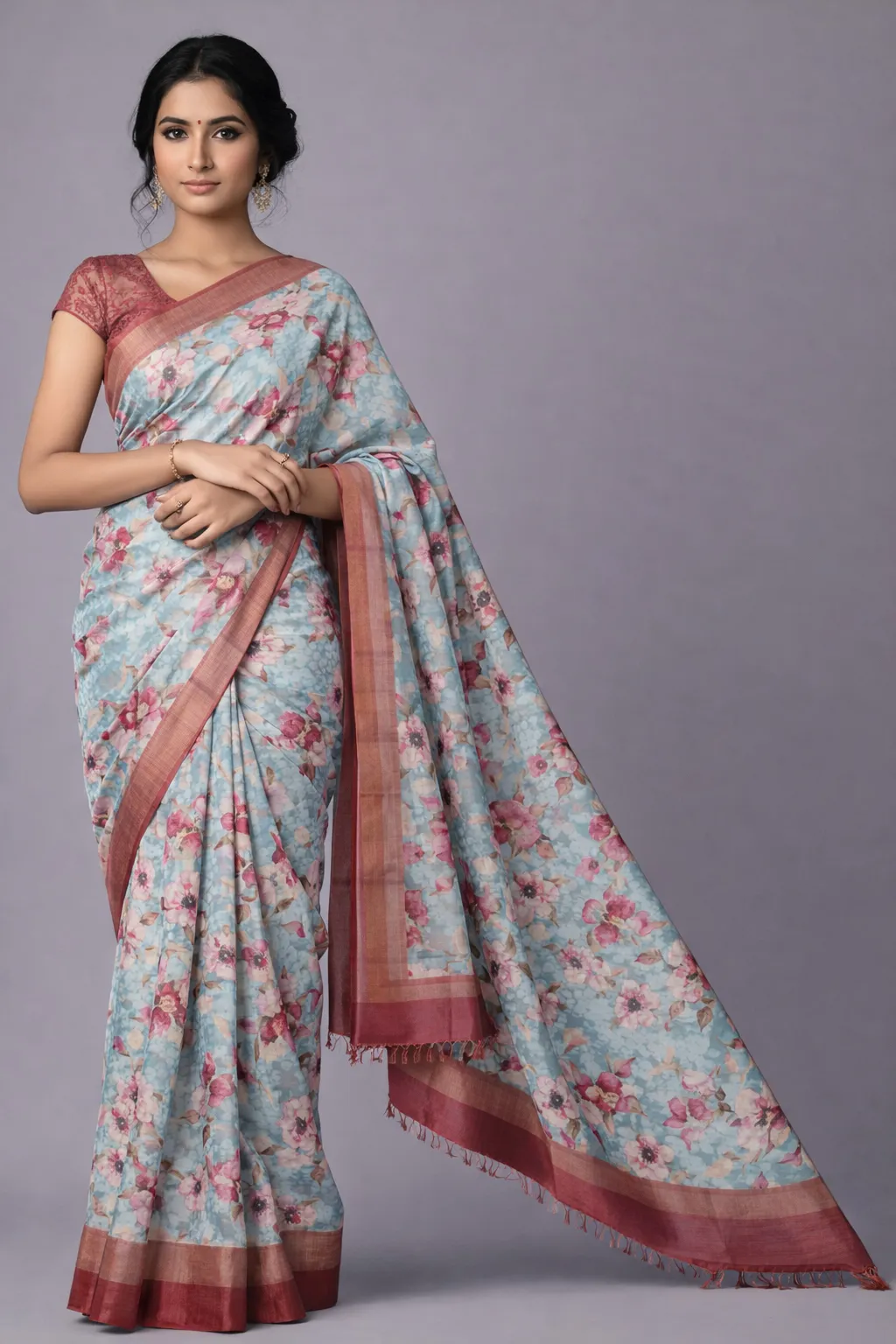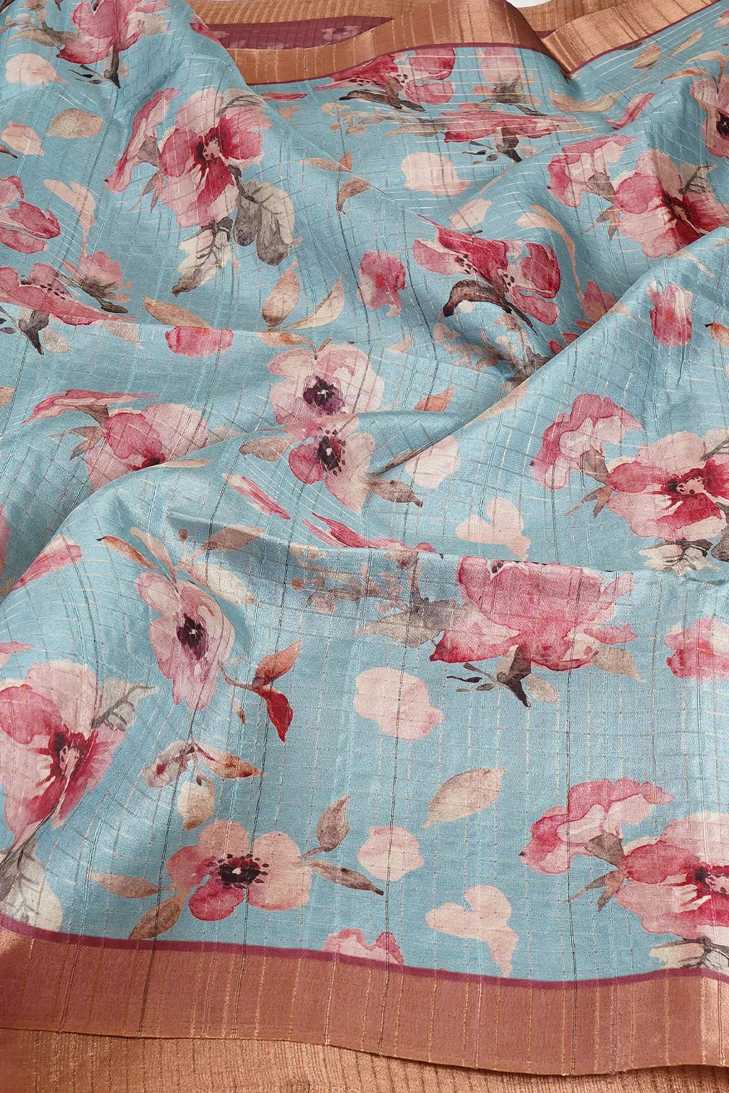 Fresh aqua base highlighted with rose pink florals and a contrasting deep pink border.