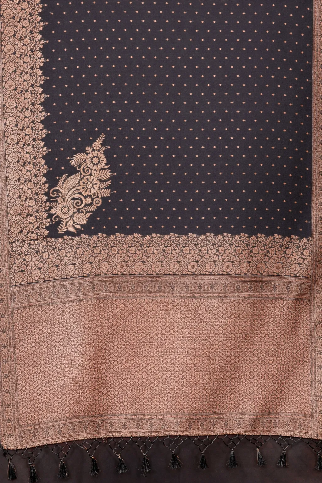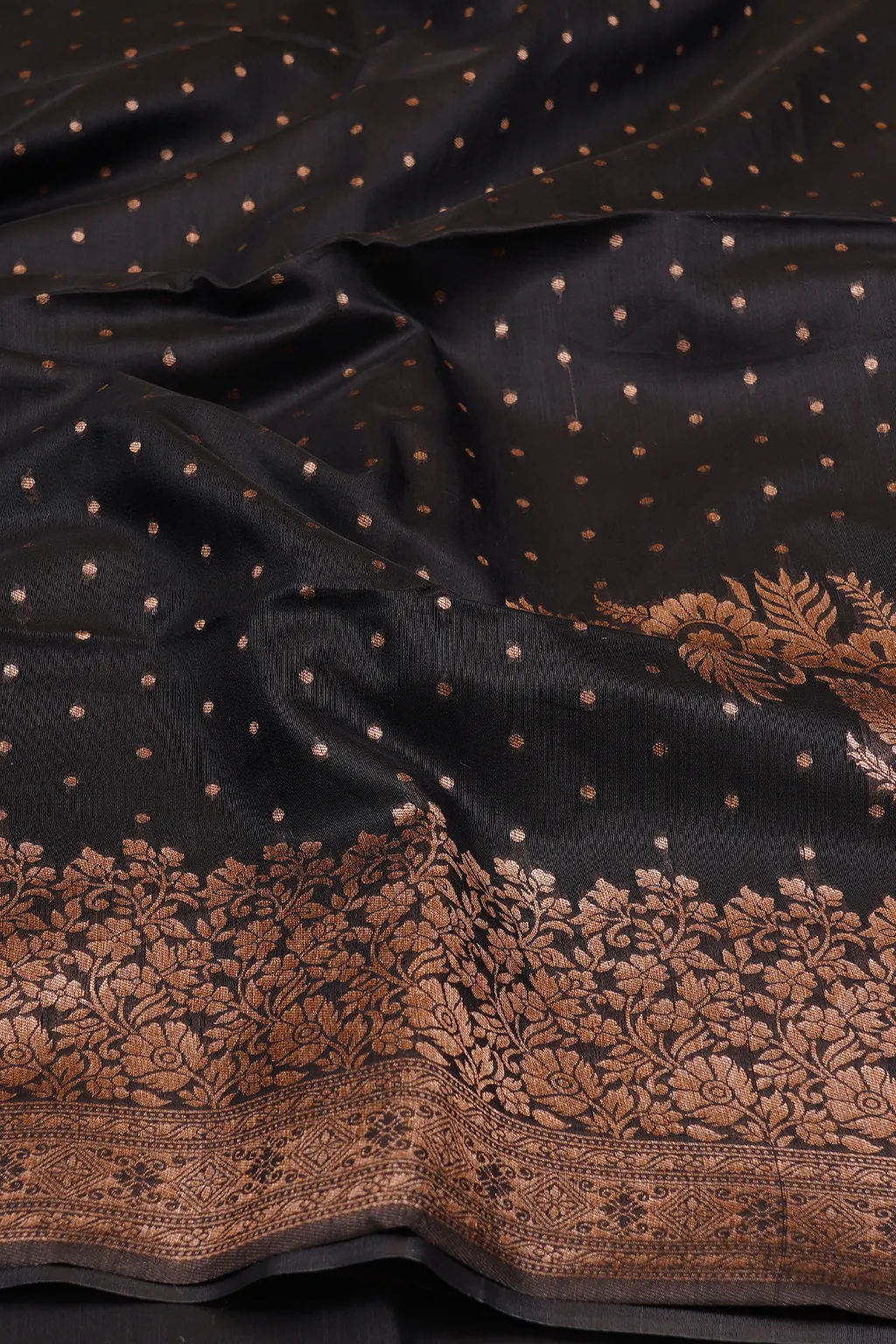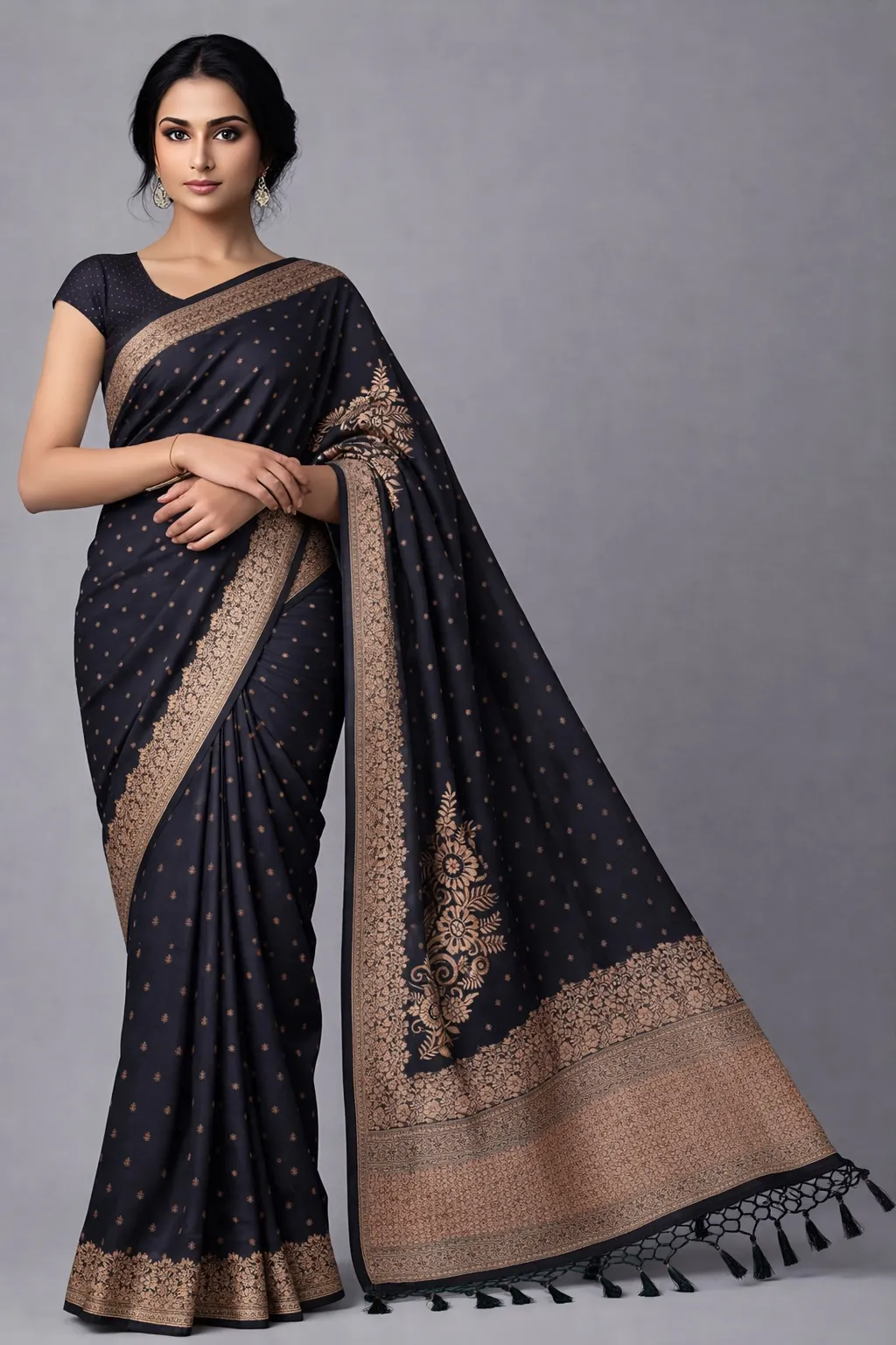 Deep black drape with intricate zari detailing. Striking, refined, and made to own the evening.