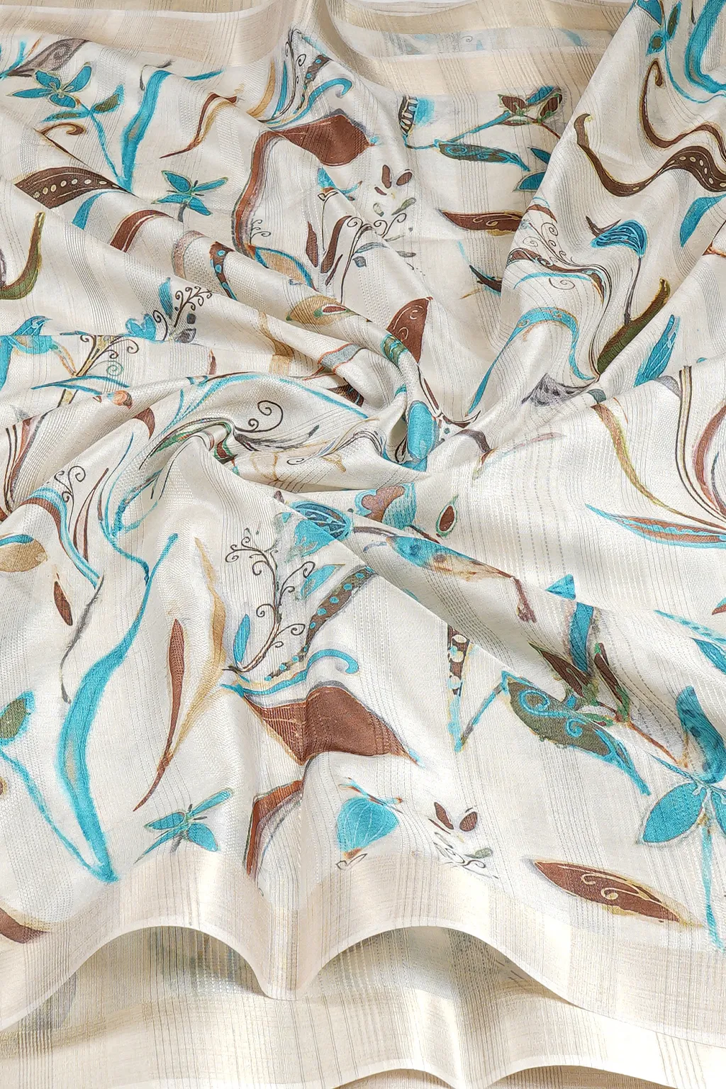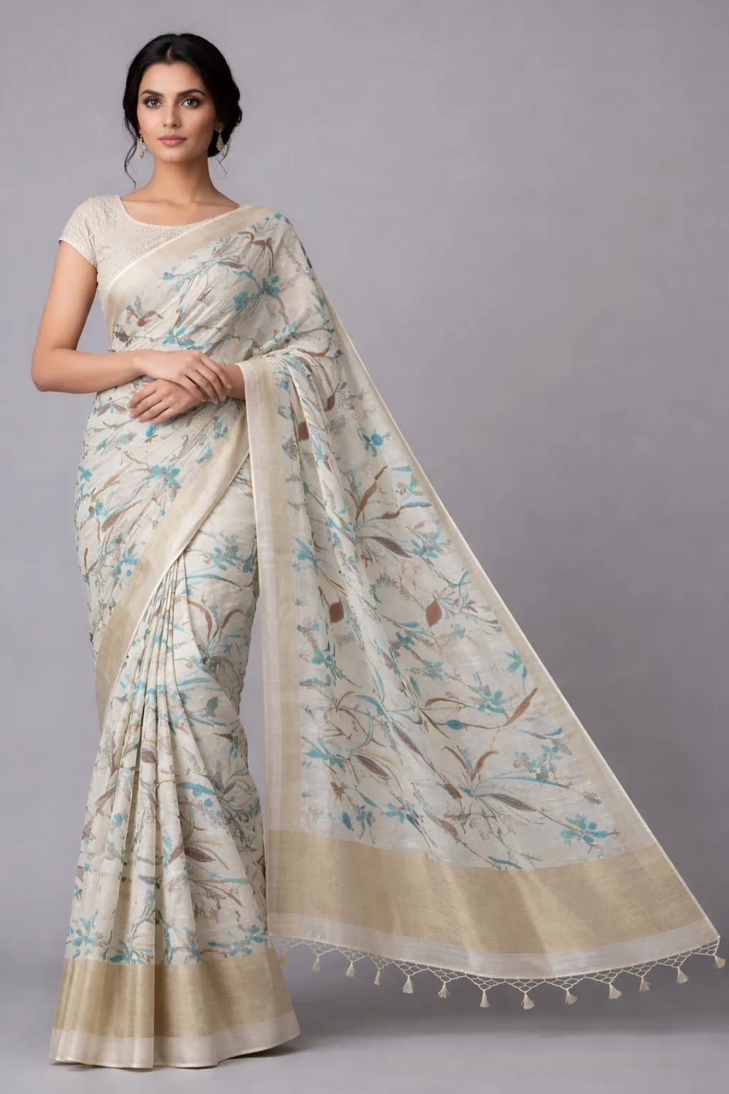 Muted cream base with elegant blue botanical motifs and a refined gold zari border