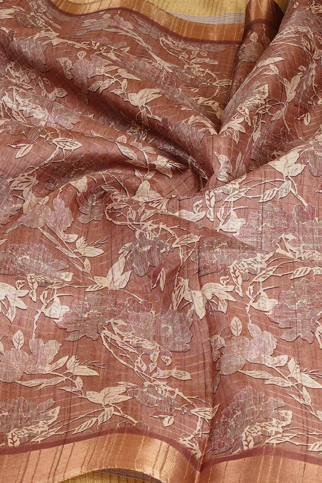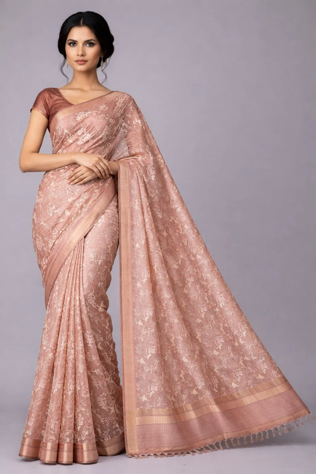 Elegant dusty peach base with delicate woven floral vines and a soft gold border finish.