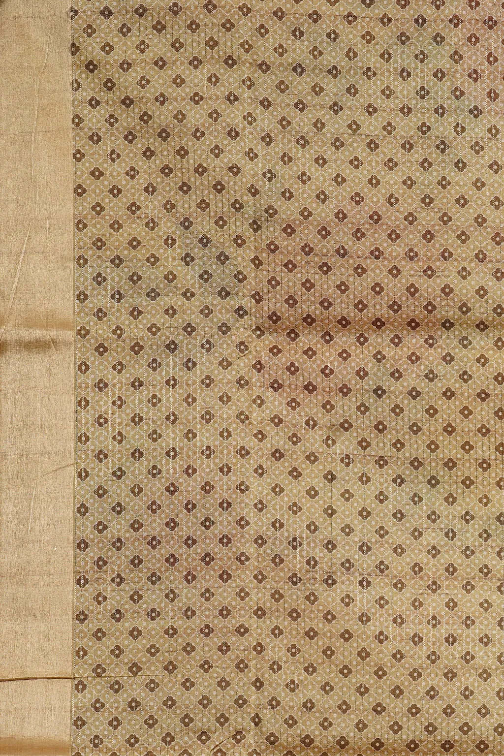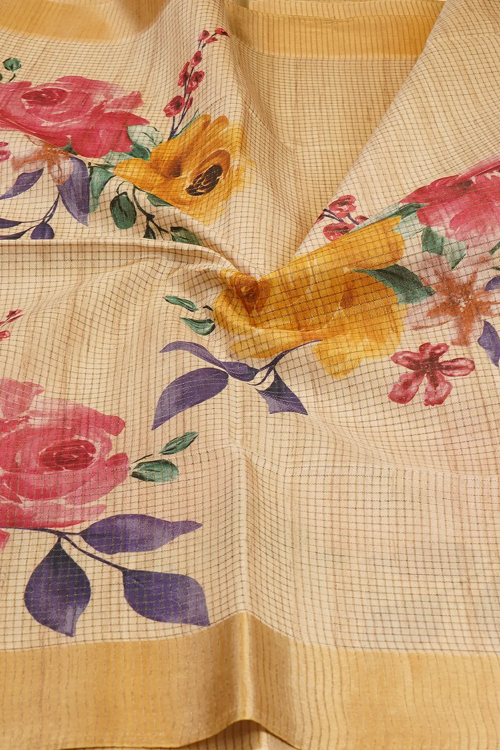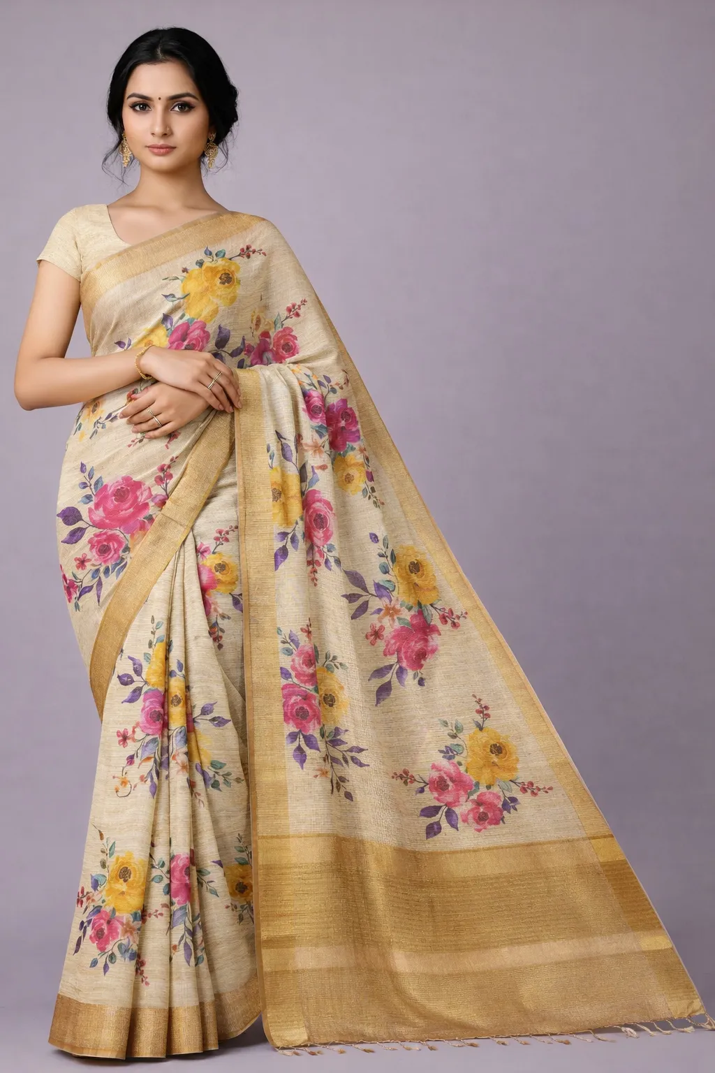 Soft beige canvas bursting with vibrant florals, finished with a rich zari border