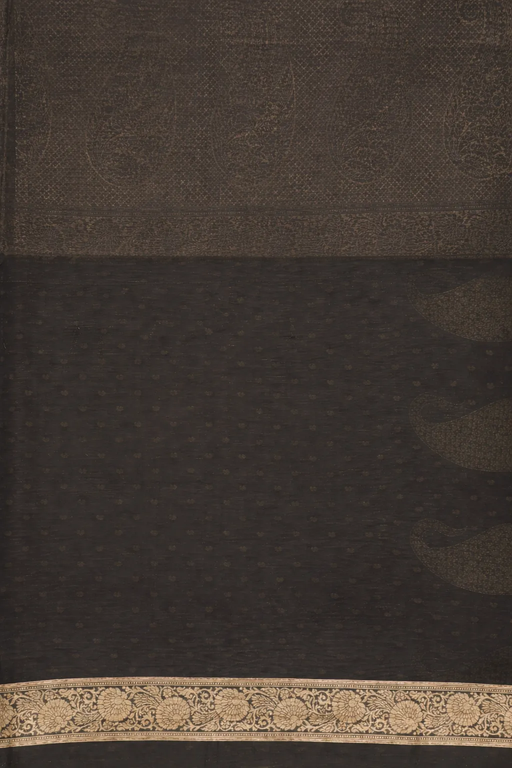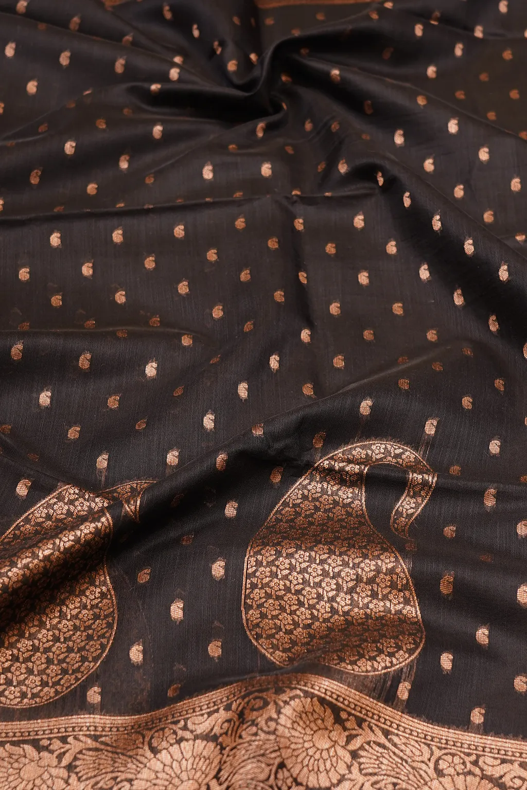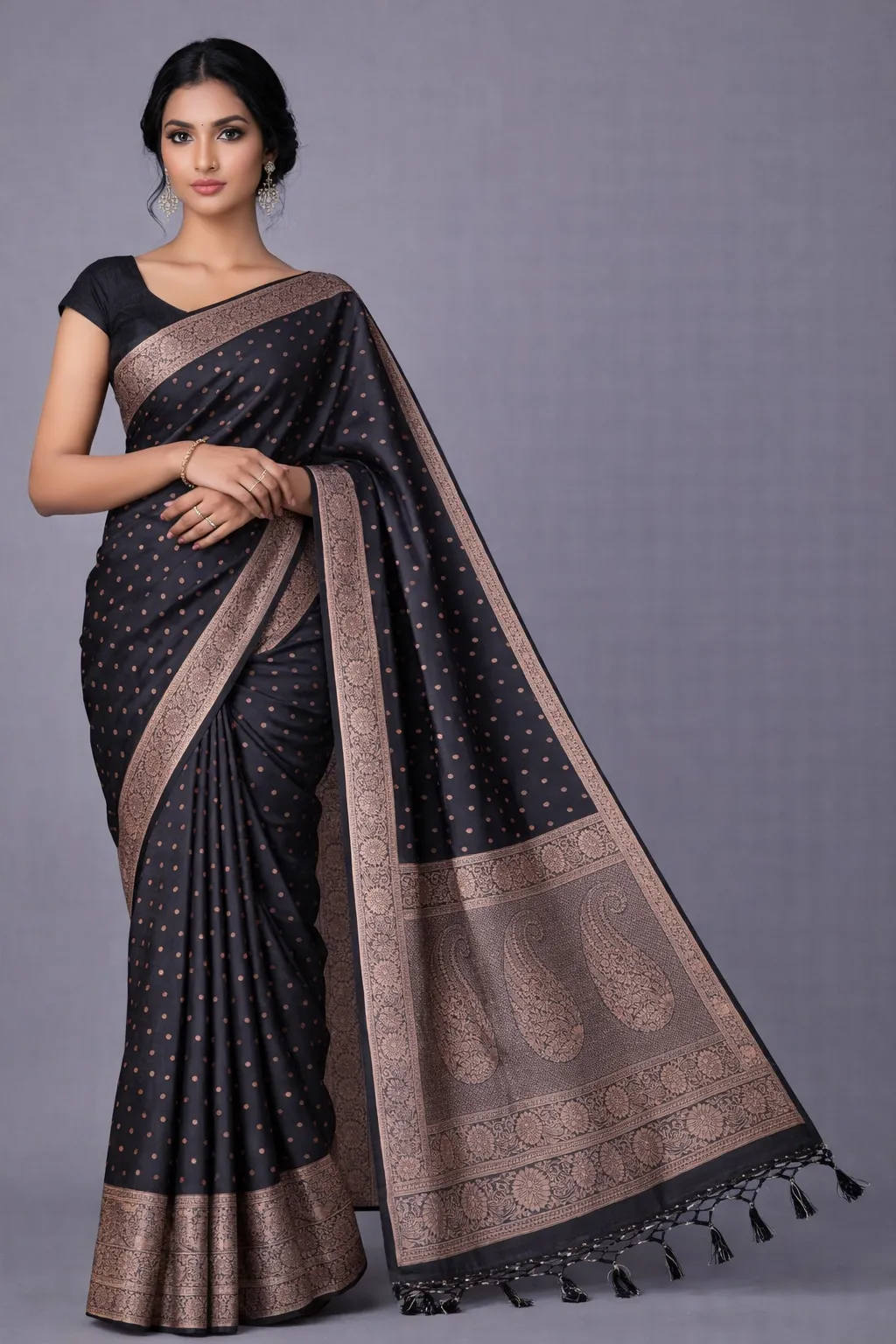 Striking black saree with gold zari buttas and a statement floral pallu design.
