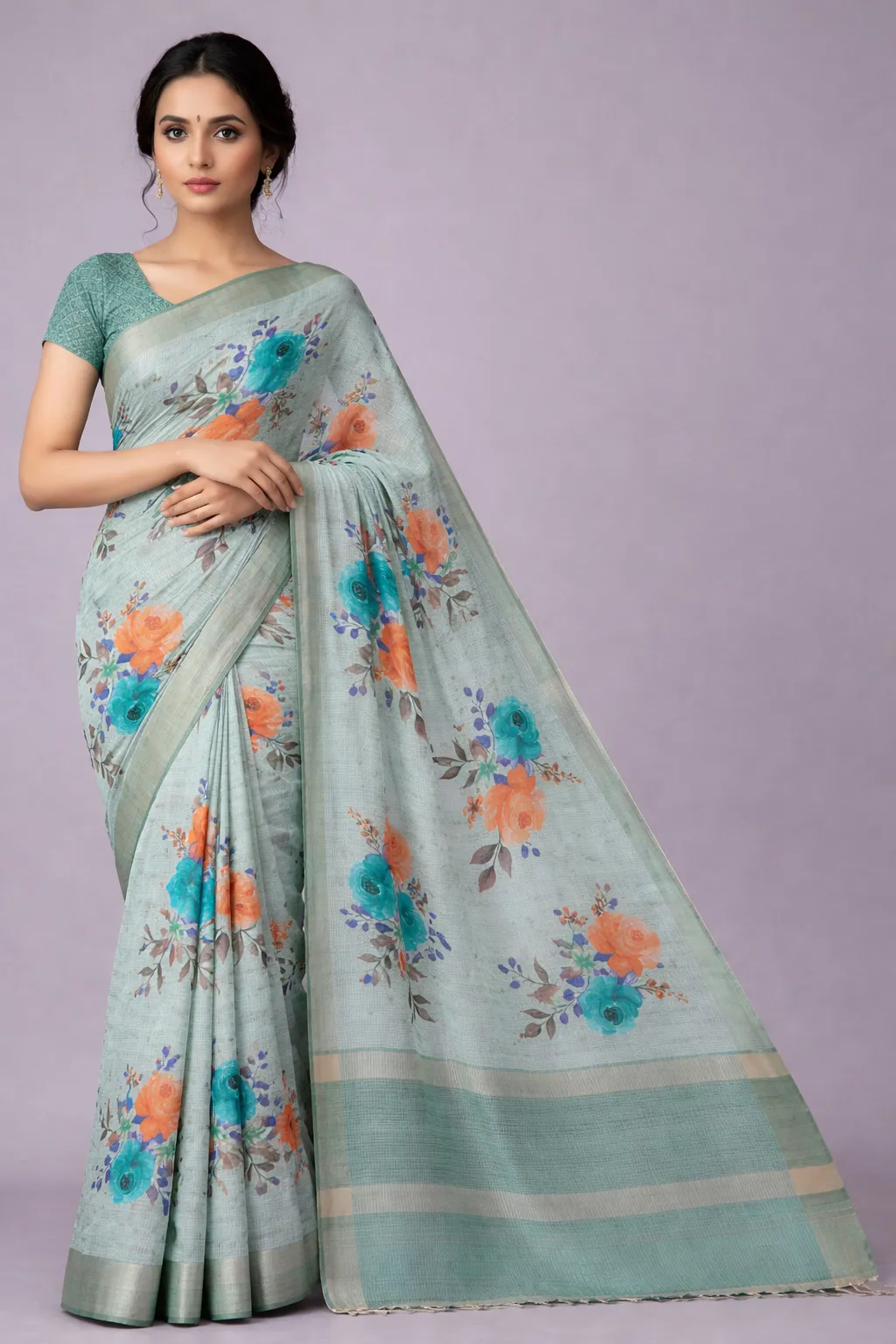 / Mint Green Pastel Floral Semi Tussar Silk Saree