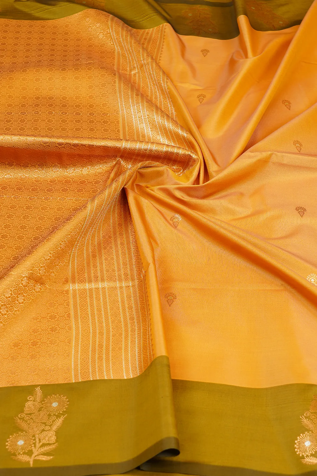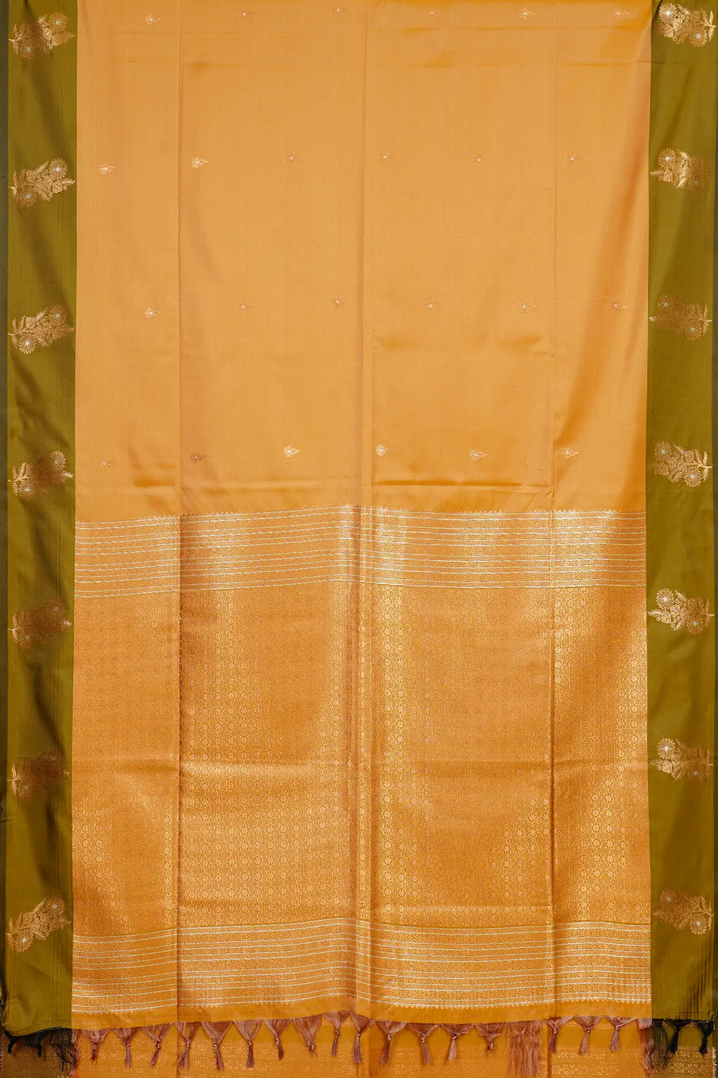 Earthy mustard paired with moss green accents creates a timeless, rooted aesthetic with refined zari detailing.