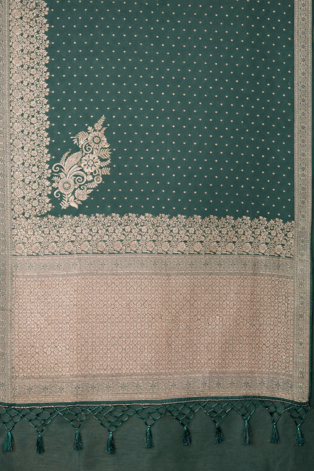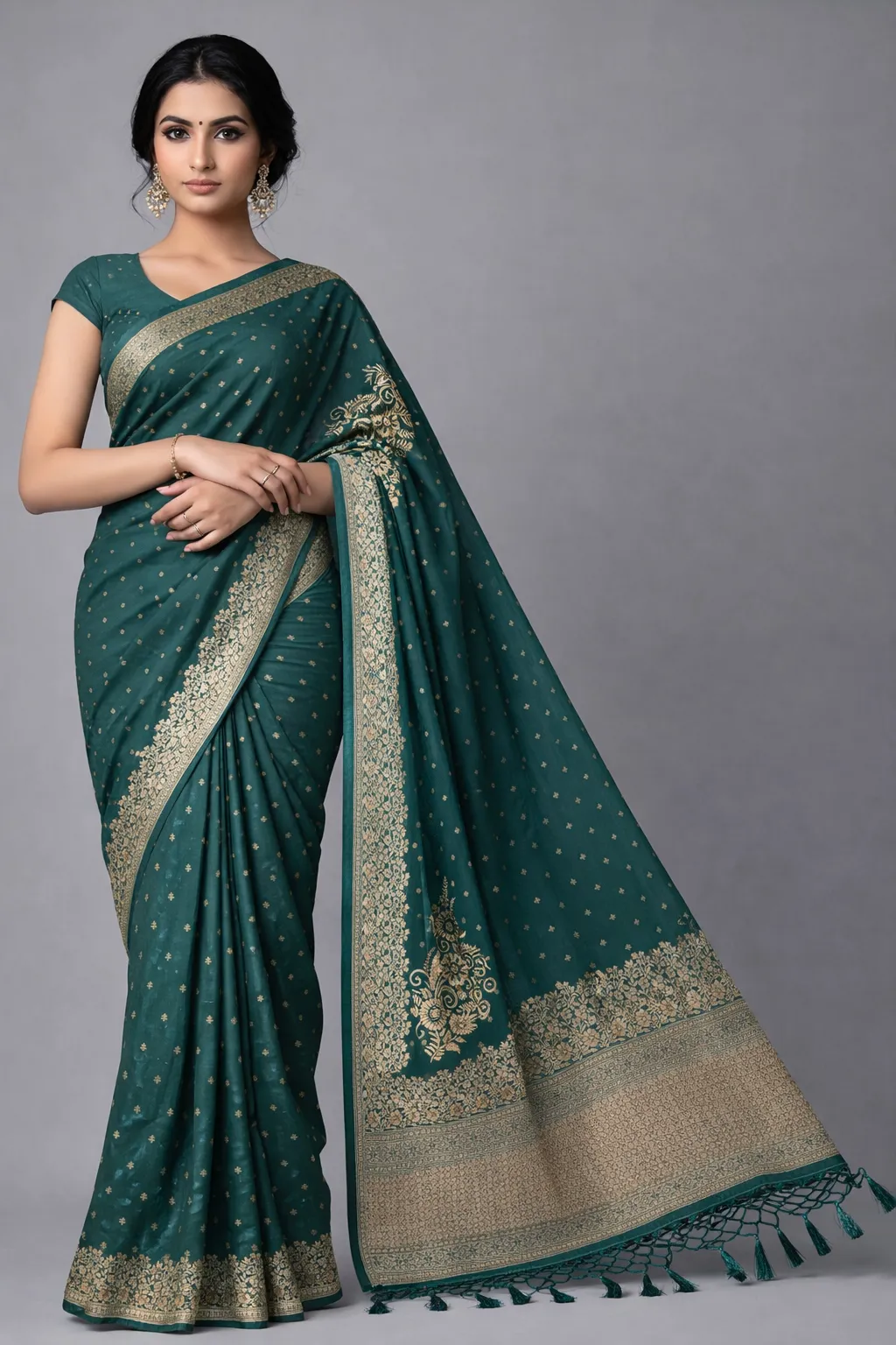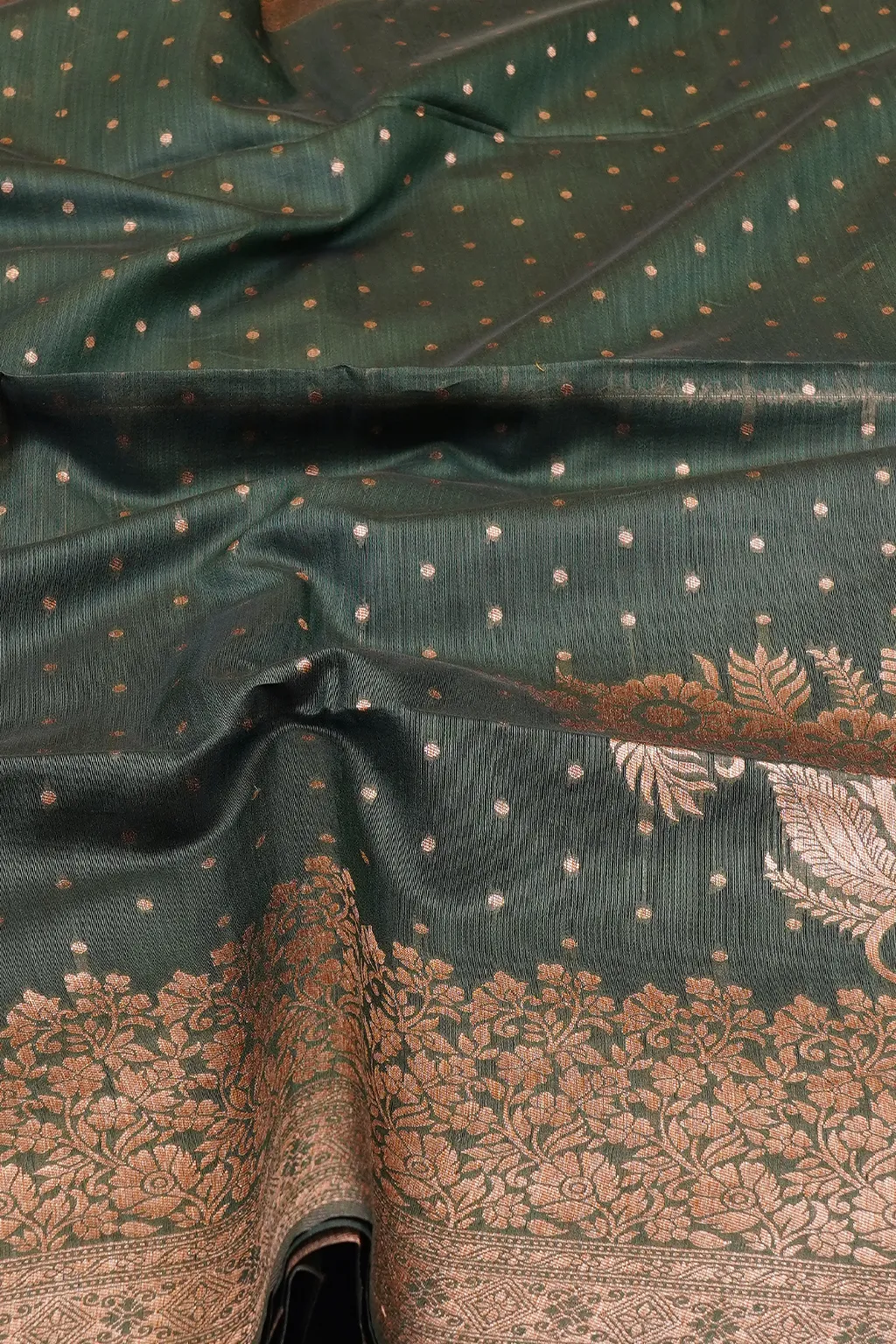 Earthy green tone with subtle zari buttas and a beautifully detailed paisley pallu.