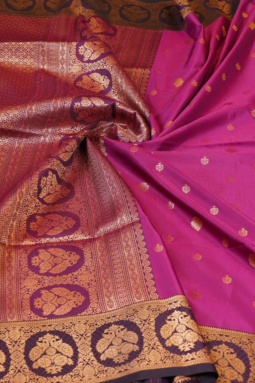 A dreamy peach drape elevated with a rich wine zari border. Light, graceful, and made to turn heads without trying too hard.