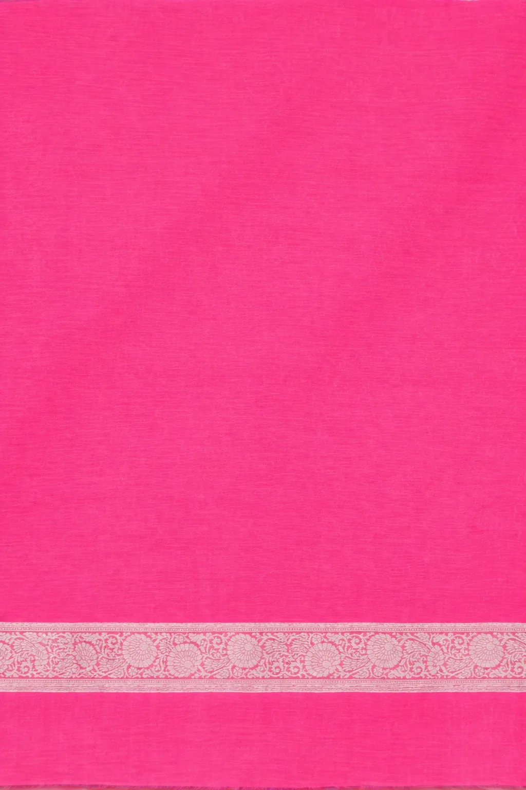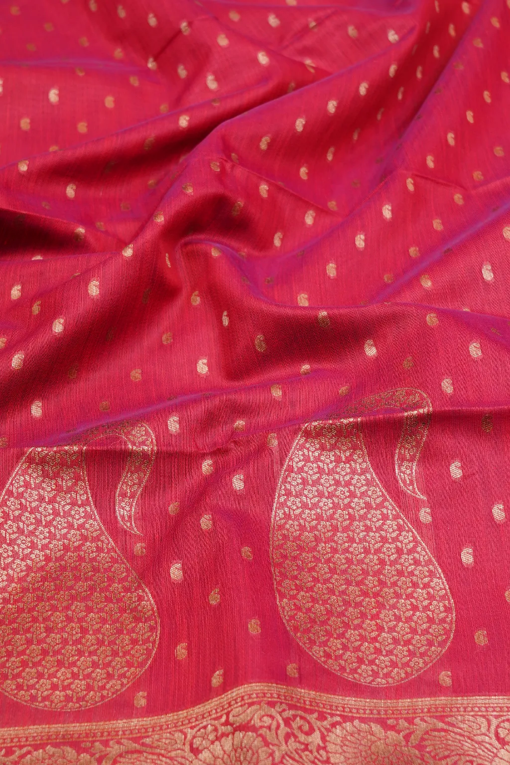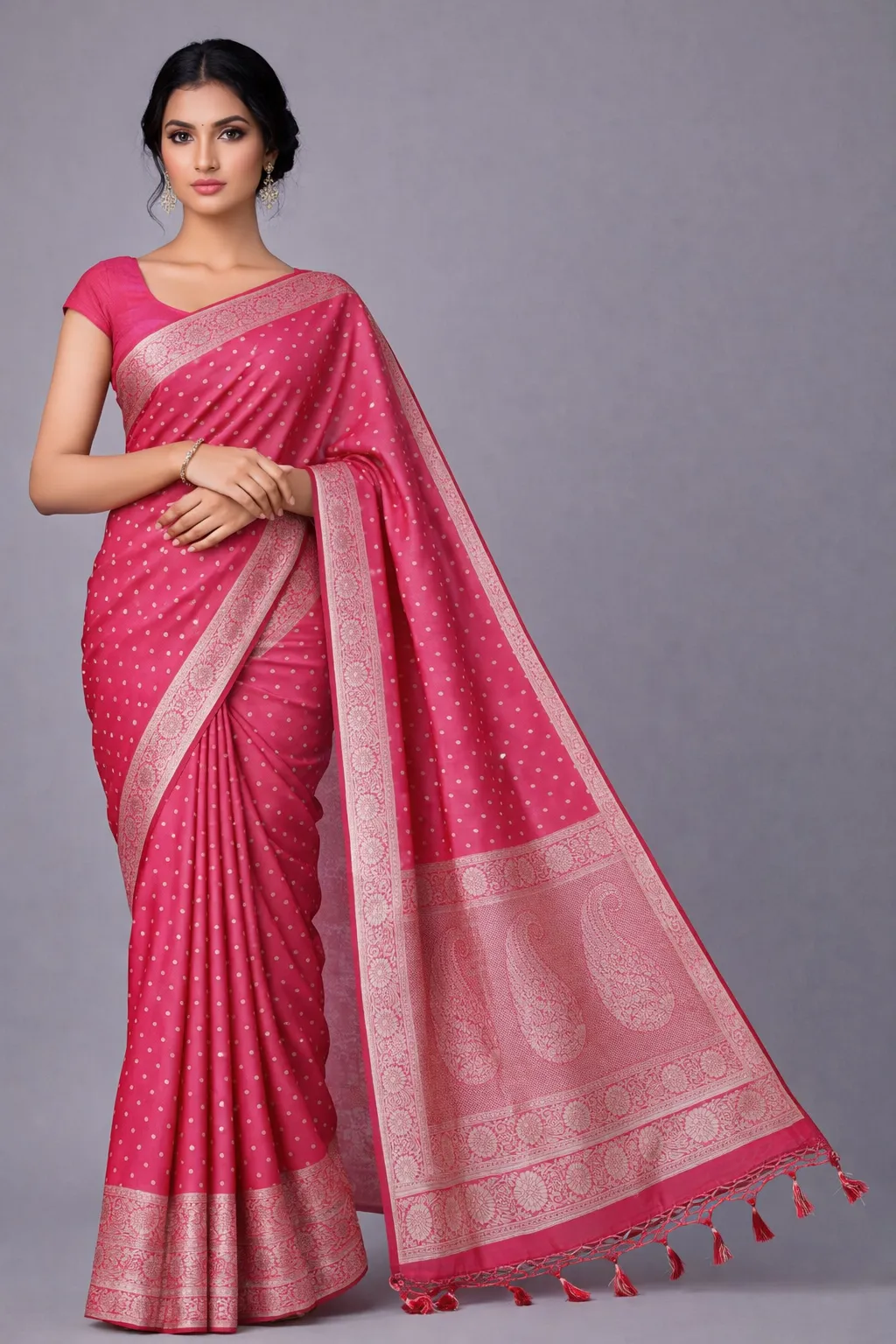 Vibrant pink saree with delicate buttas, finished with an ornate paisley pallu.