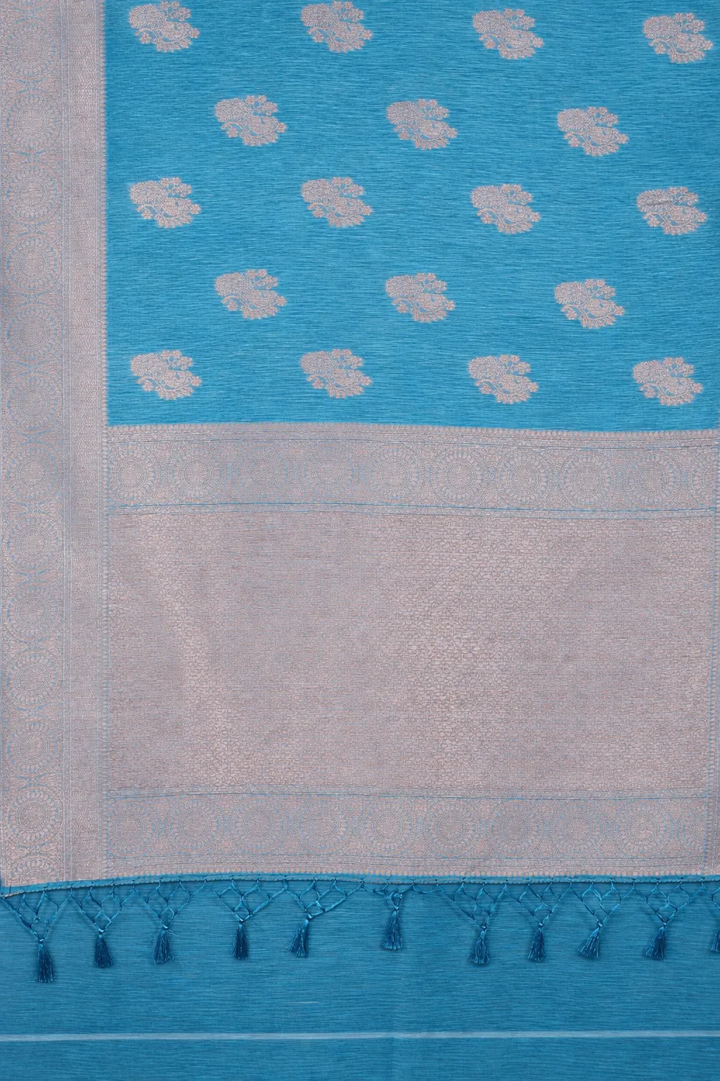 Elegant sky blue semi raw silk saree with floral buttas and soft zari border.
