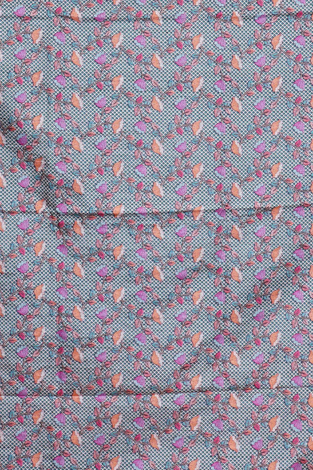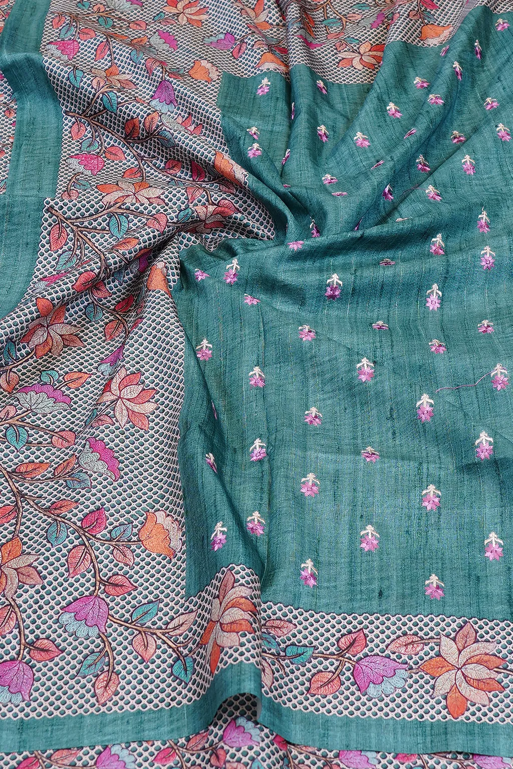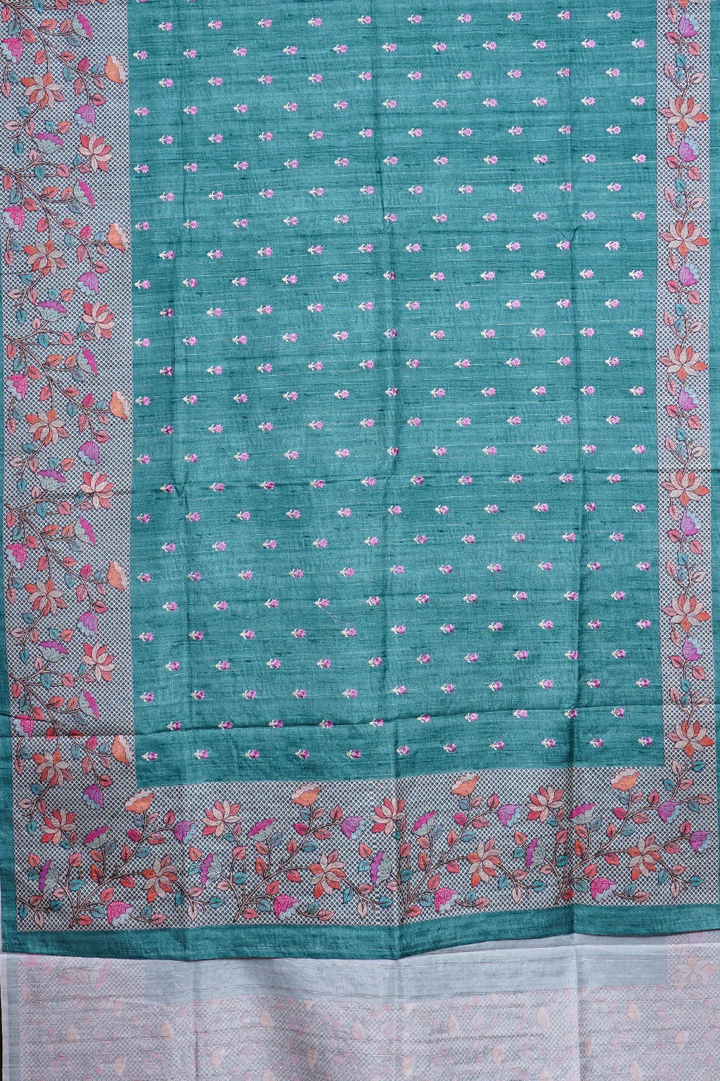 A soothing teal green canvas adorned with fine floral motifs and a beautifully woven border. Effortlessly graceful, perfect for day occasions and refined evenings.